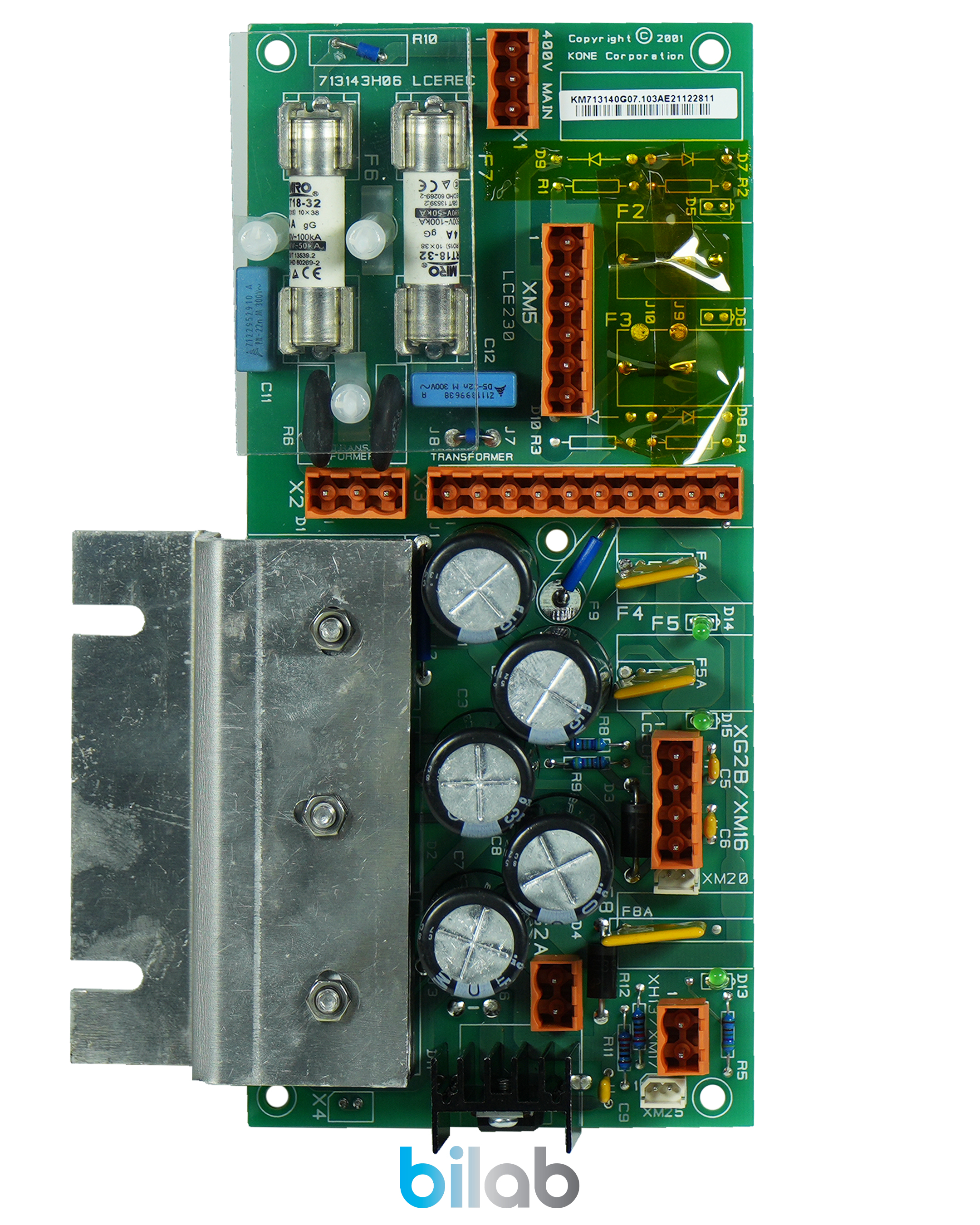 KONE LCE serisi asansör sistemlerinde kullanılan bir AC/DC doğrultucu ve sigorta kartıdır. Bu kart, trafodan gelen AC gerilimi doğrultarak sistemin ihtiyaç duyduğu DC beslemeyi üretir.